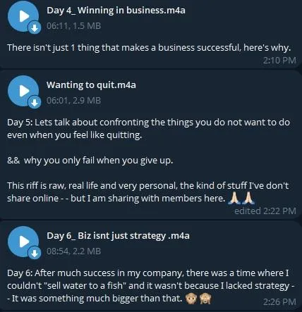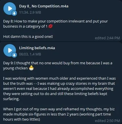 Quick, powerful trainings straight to Telegram. Sales, content, leadership, mindset, offers, energy; nothing is off limits. And you get them from both Echo & Joey. This space moves fast, so we share our thoughts and breakthroughs all the time, in real time. Unfiltered, raw, real. ($4000+ Monthly Value)